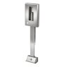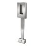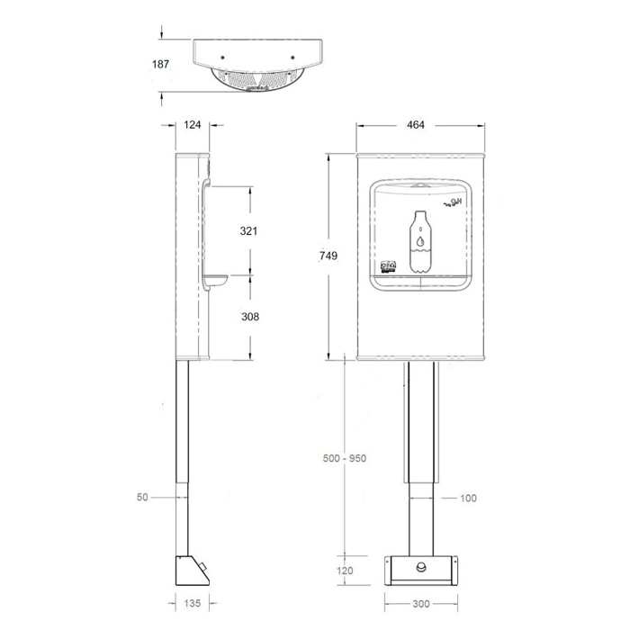 Stainless steel wall mounted bottle filling station with foot operated water supply. The foot operation eliminates the need for the users to touch the unit with their hands and reduces the chance of spreading viruses and germs. The wall mounted design allows installation onto the face wall with the water supply and waste connections through the back wall. The stainless steel foot plate houses the foot operated water valve with a telescopic pipe shroud between the foot plate and the bottle filler.