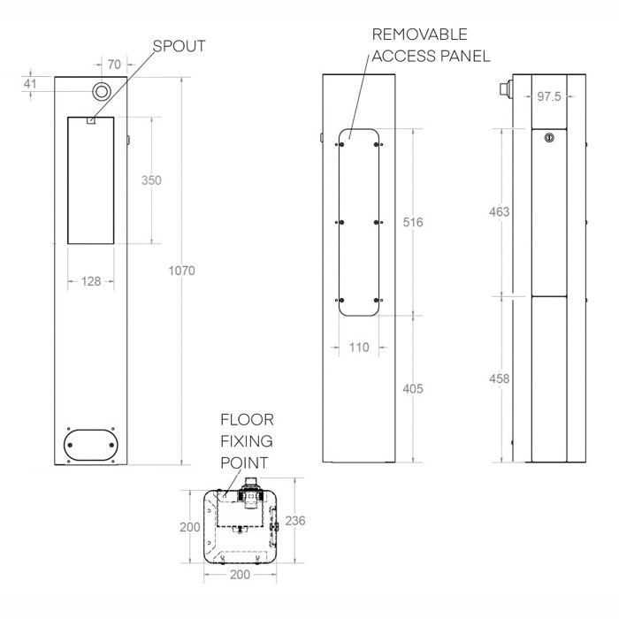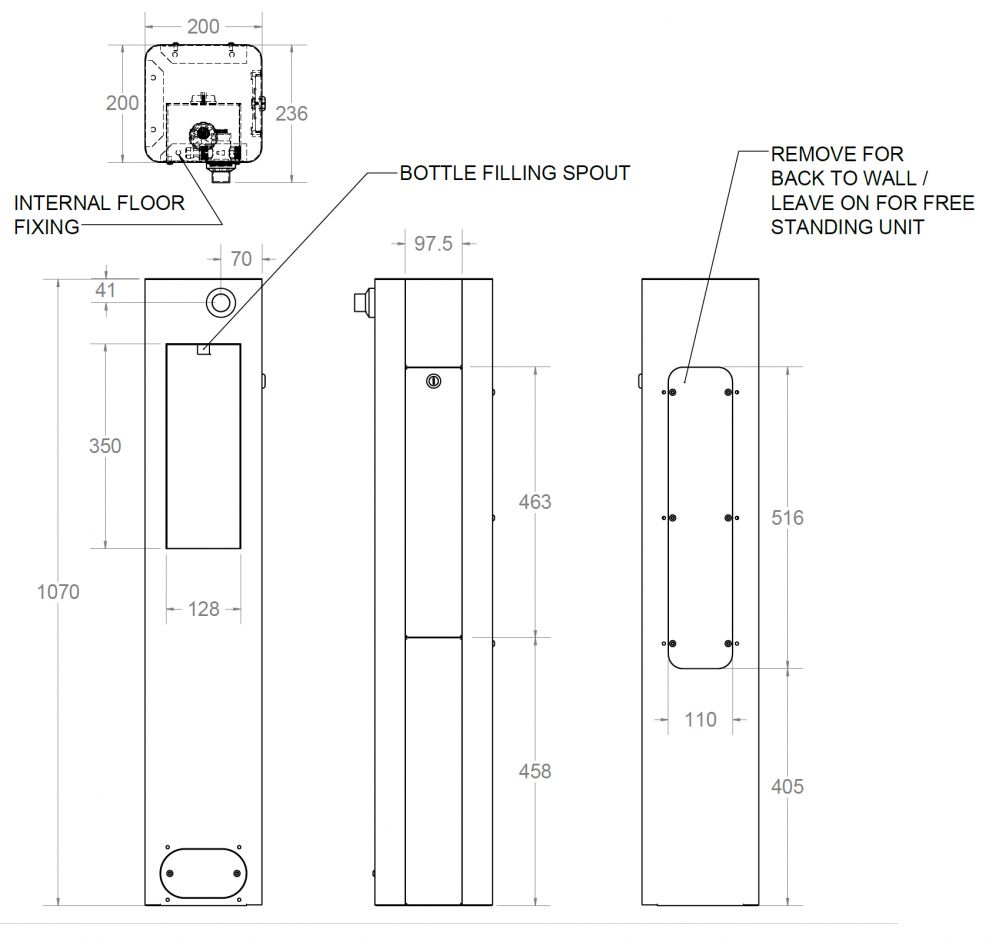 - Free standing pedestal unit or adapted to floor and wall mounting by removing the back panel.