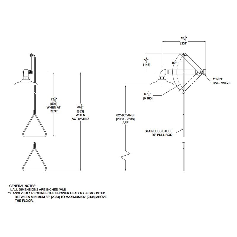 - Horizontally mounted drench shower with plastic shower head 190mm diameter.