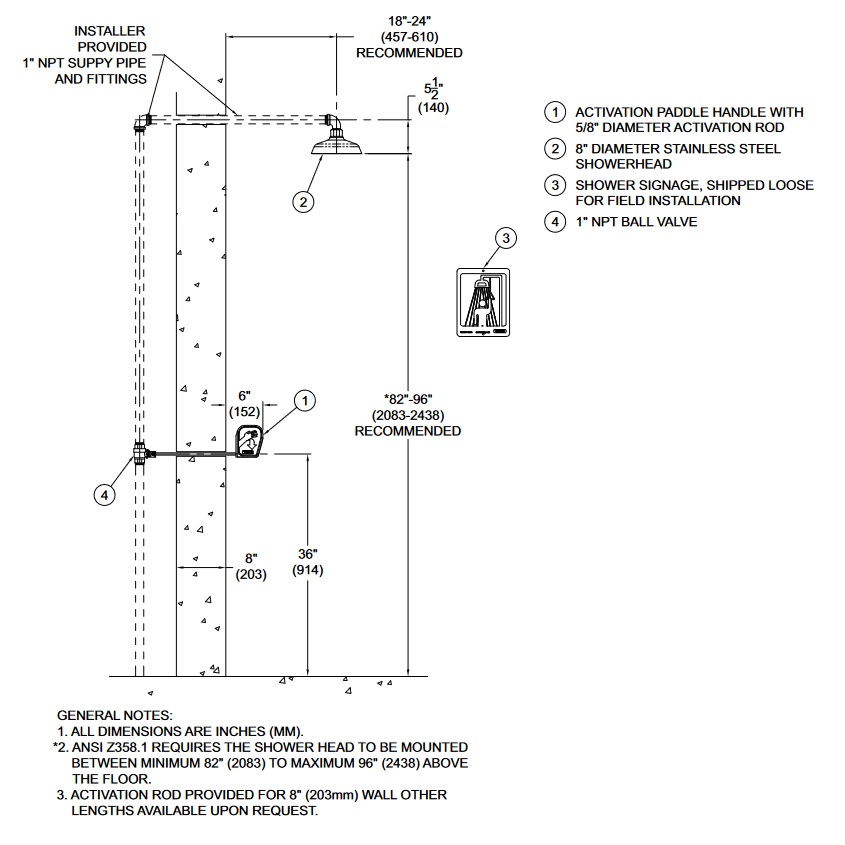 - Freeze resistant horizontally mounted drench shower with stainless steel shower head 188mm diameter.