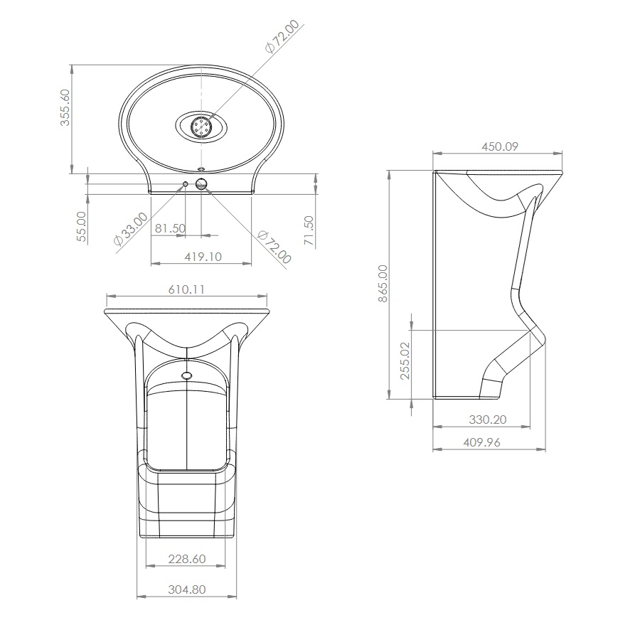 - 305mm wide (bottom basin).