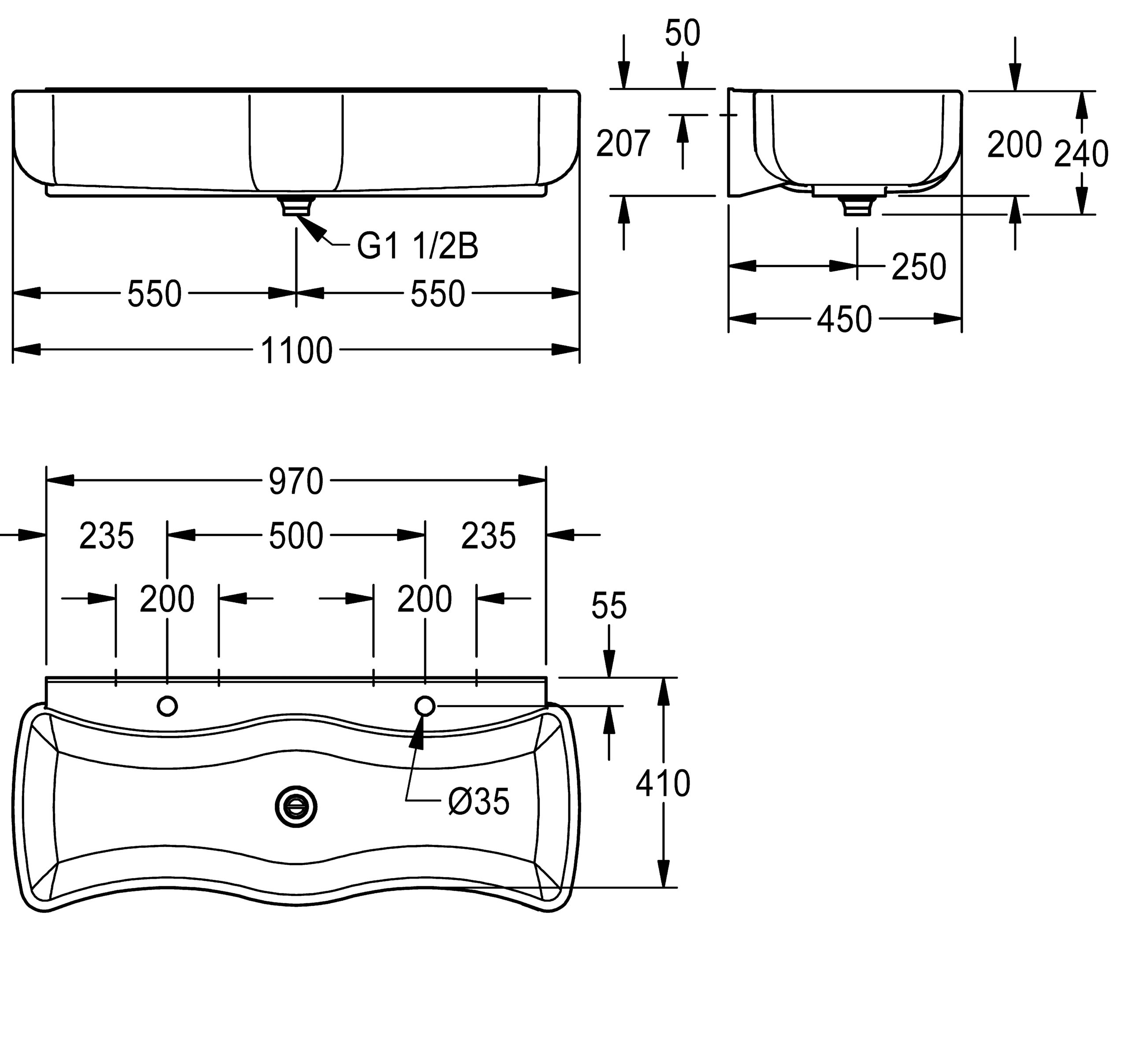 - Front to back 450mm (410mm from tap hole to wave recess).