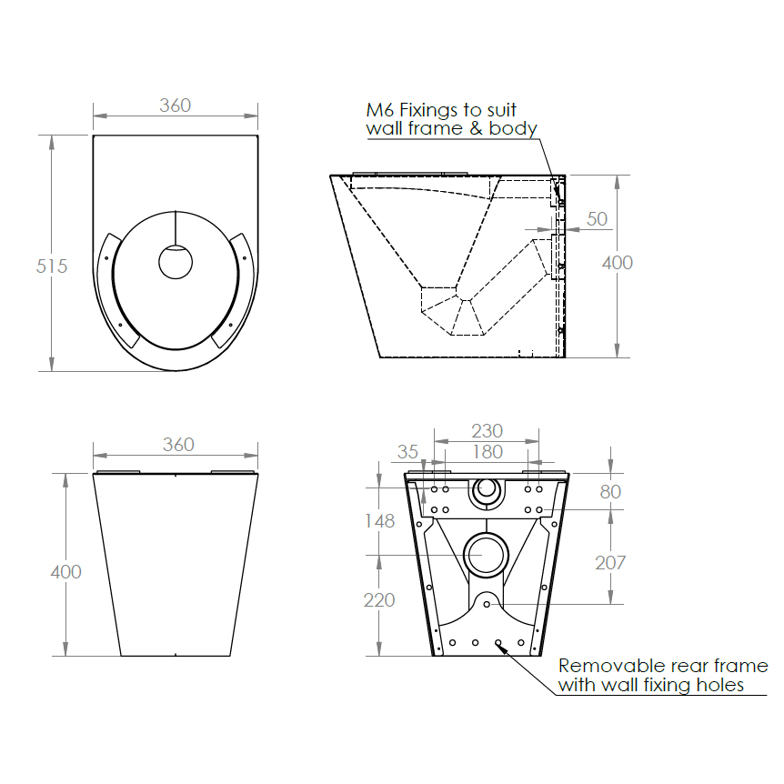 - Stainless steel back to wall shrouded WC Pan with fitted black seat pads.