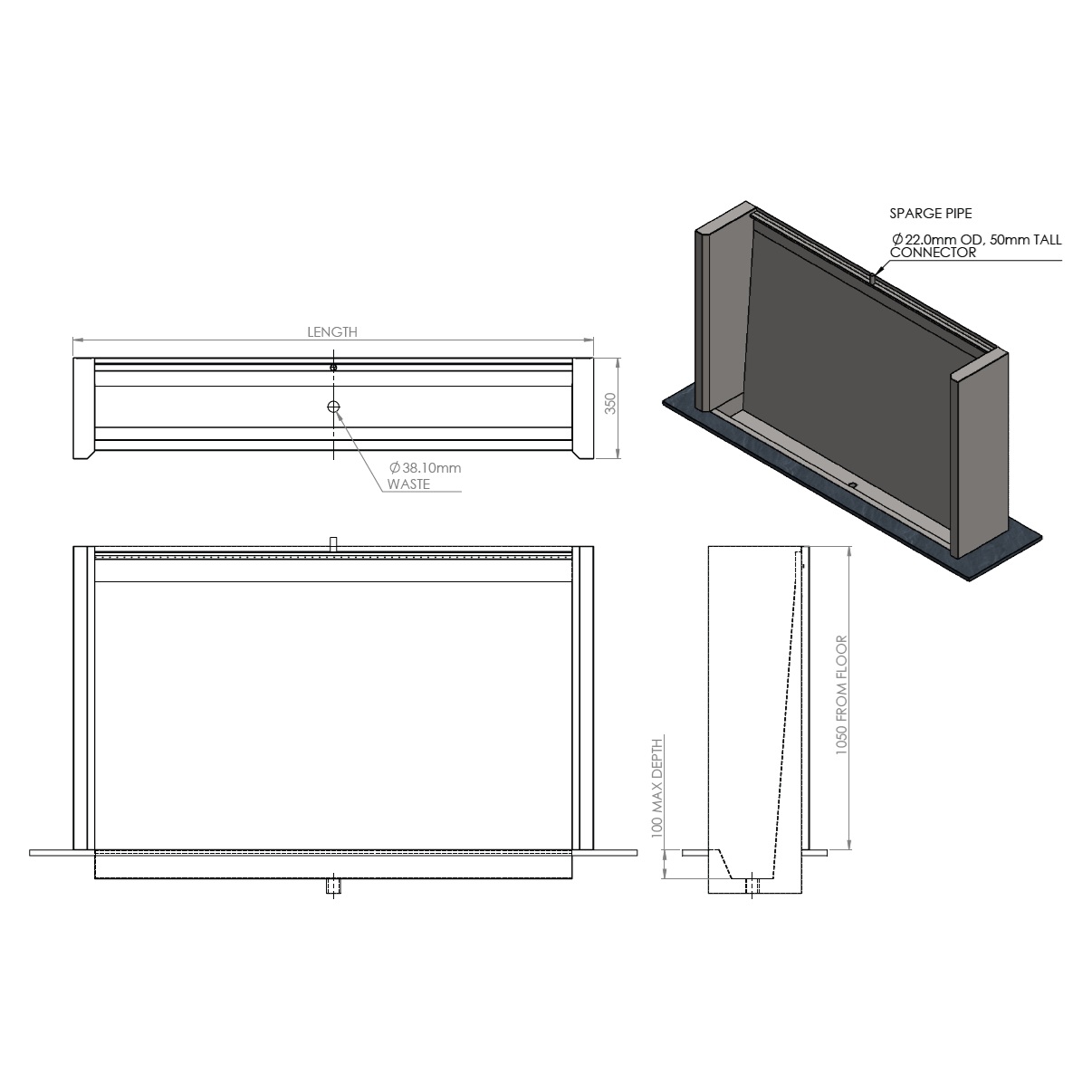 Stainless steel floor recessed slab urinals with a satin polish finish. The recessed urinals are available to order online in five standard sizes, and can be manufactured to order in any size up to and including 3300mm in one piece. The floor recessed urinals are supplied with: