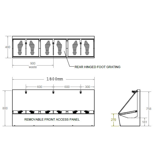 - Stainless steel hinged lift-up foot grating to aid cleaning.