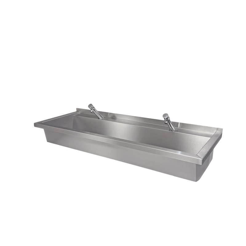 - The wash troughs come complete with time flow press button taps, a 38mm chrome plated domed central waste fitting, and integral wall fixing brackets.