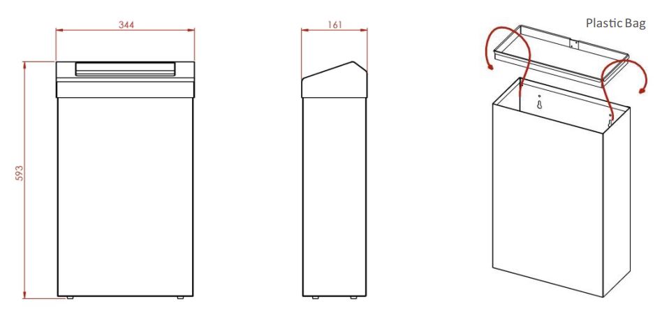 - Wall mounted or floor standing stainless steel waste bin.