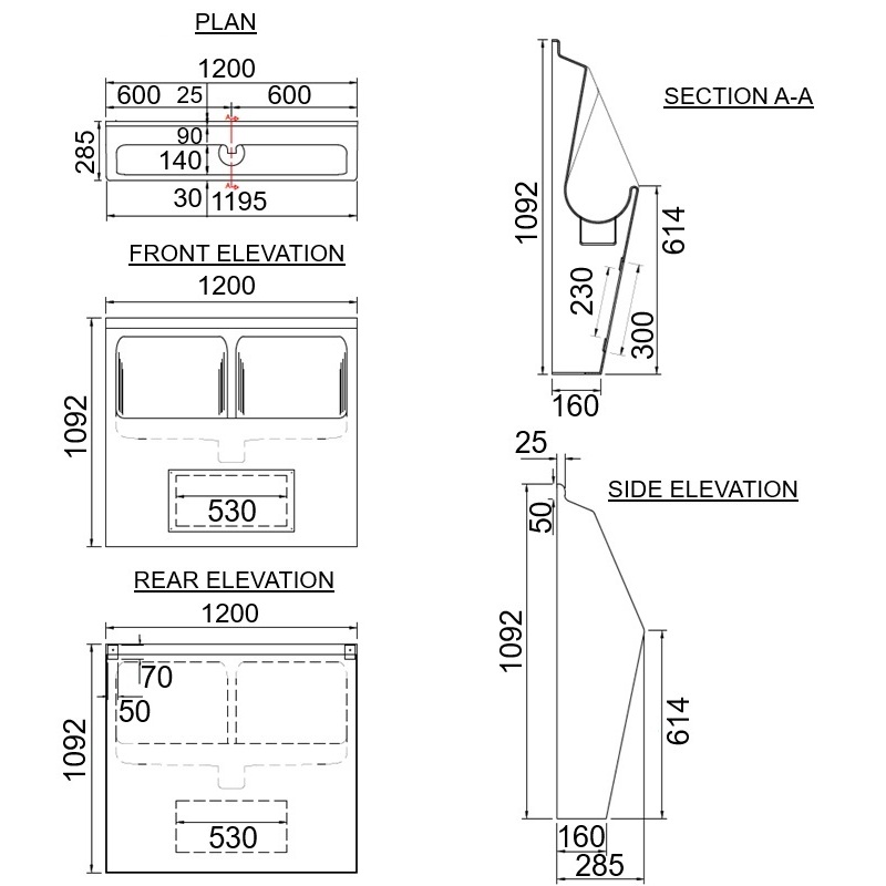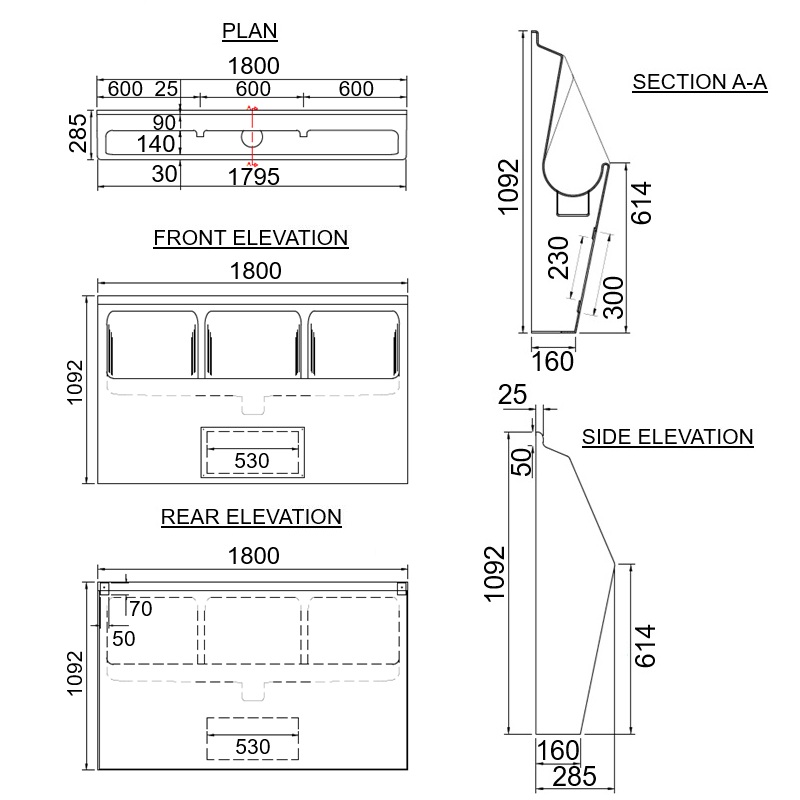 Trough urinals are made from GRP material, which is a lightweight, durable substance with a smooth gloss finish that is easy to clean and requires minimal maintenance. Floor-standing urinals come complete with end panels to make them suitable as standalone units or you can install them side by side to create any size from a combination of different standard sizes. The WUFS model urinals are available to order online in three standard sizes: 600mm, 1200mm, 1800mm and as standard, they are available in 1, 2, and 3-user units. They can also be custom-made to order in a variety of sizes. The urinals come complete with a waterless cartridge waste as standard.